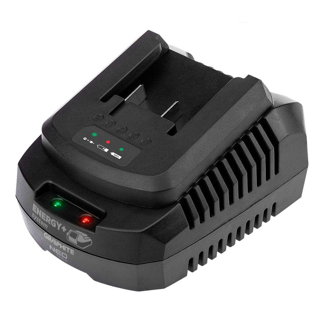 - Energy+ 18V Li-ion akkumulátor töltő, 2.3 A maximális töltési árammal és 1 óra töltési idővel az 58G001 esetében, 2 óra az 58G004 esetében és 3 óra az 58G086 esetében.