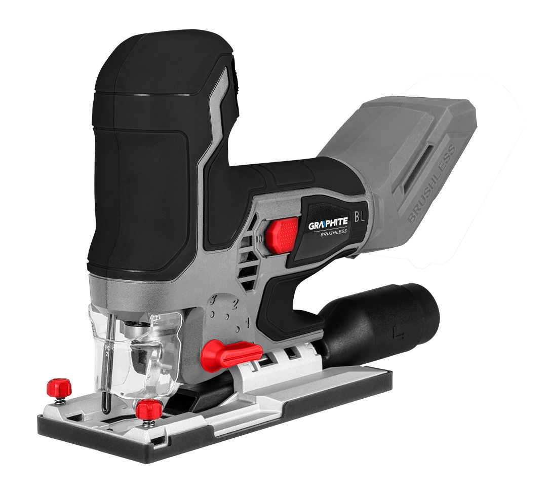 - Energy+ 58GE145 szénkefe nélküli szúrófűrész a GRAPHITE-tól, 800-3800 löket/perc löketszámmal és 25 mm-es lökethosszal.