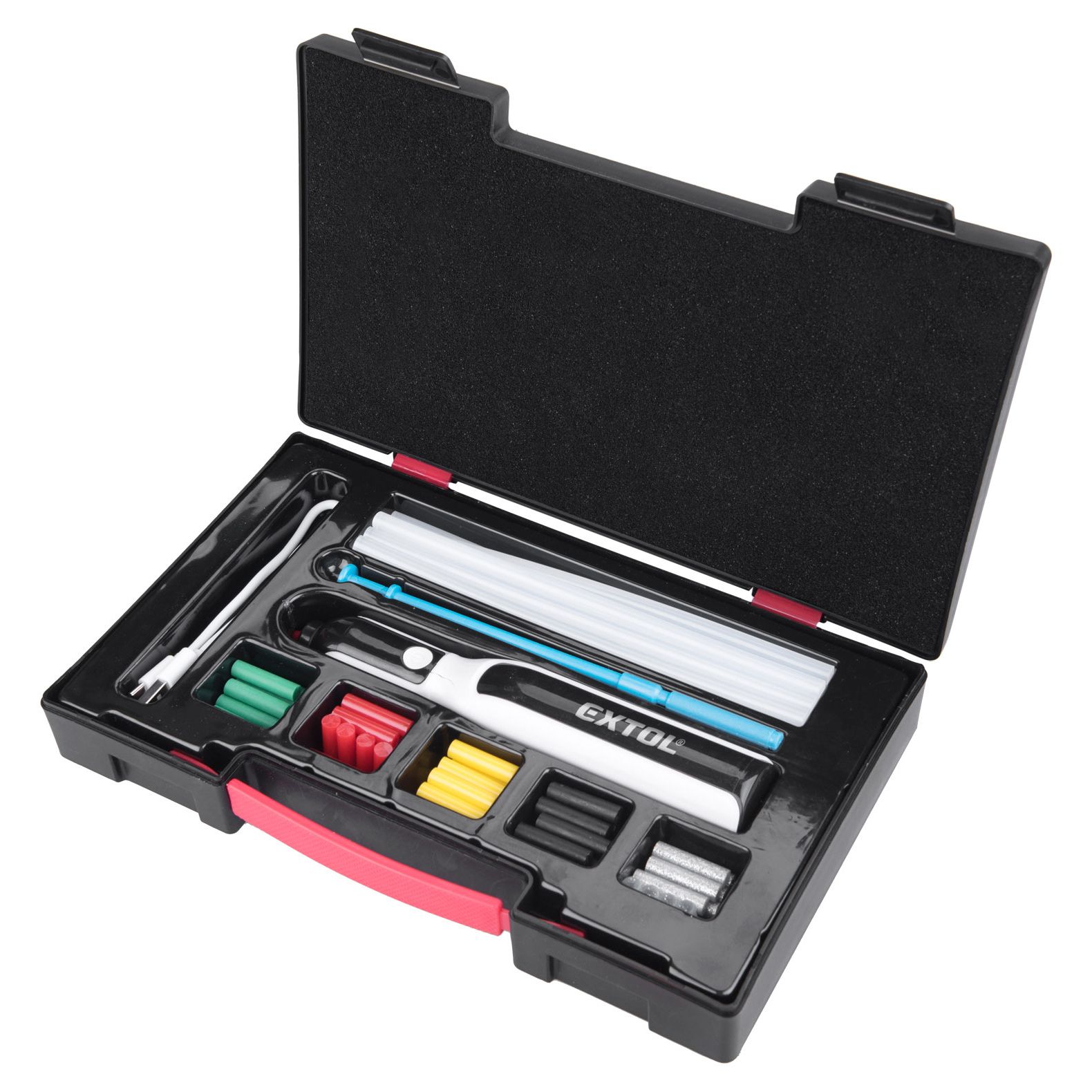 - A készülék háza ergonomikus és kényelmesen fogható, ugyanúgy ahogy a ceruzák, és a vékony kifolyó ragasztónak köszönhetően finom és precíz munkákhoz is használható. A készüléket szerszámos dobozban forgalmazzuk, és a készülékhez 18 cm hosszú transzparens, valamint 2,5 cm hosszú különböző színű színes ragasztórudakat is mellékeltünk. A színes ragasztórudak csak 2,5 cm hosszúak, hogy könnyeben cserélhesse azokat és különböző színekkel tudjon ragasztani.